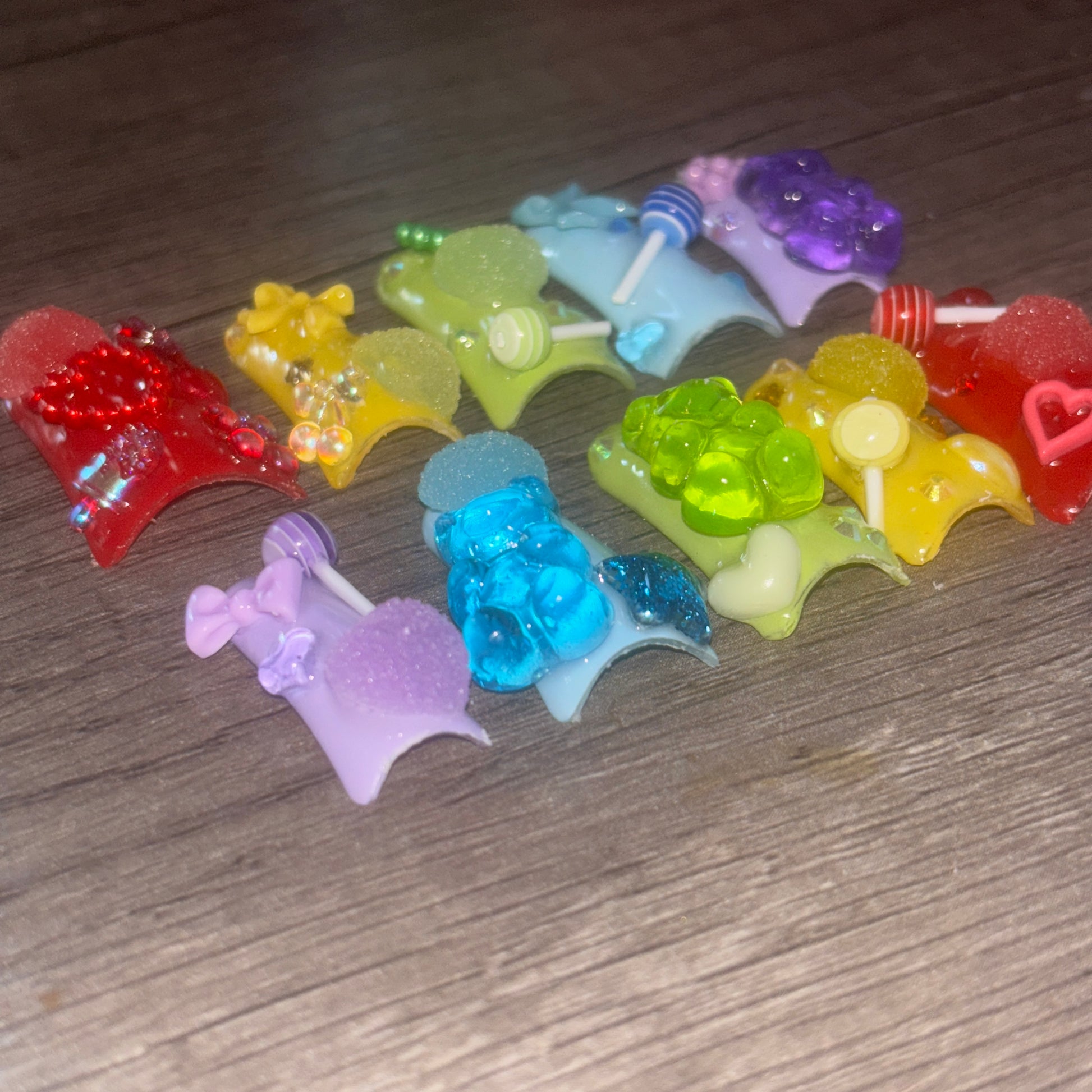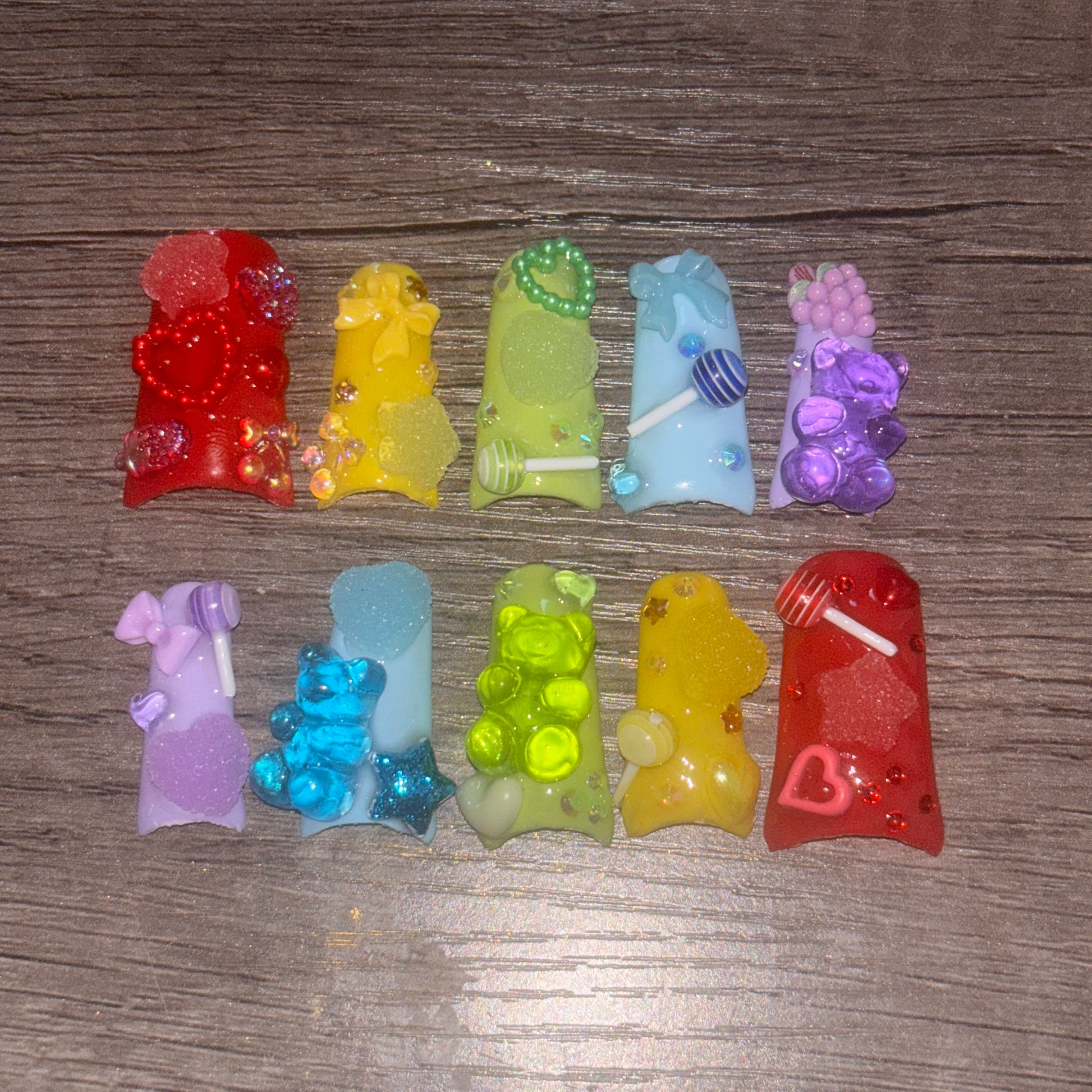 Get ready to brighten your day with the "Amara" Set—rainbow junk nails packed with cute, colorful charms! These durable, reusable press-on nails offer salon-quality glam without the hassle, making nail fun super convenient. Perfect for mixing, matching, and making every look your own!