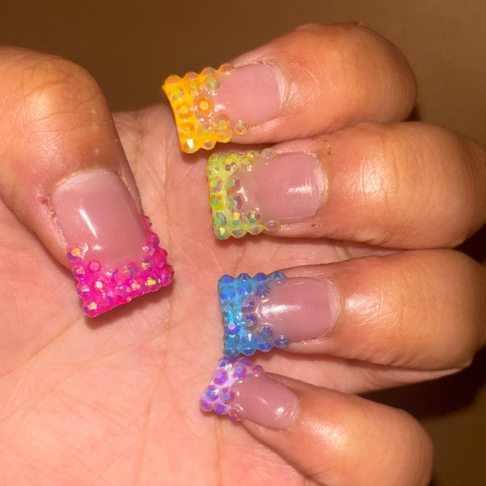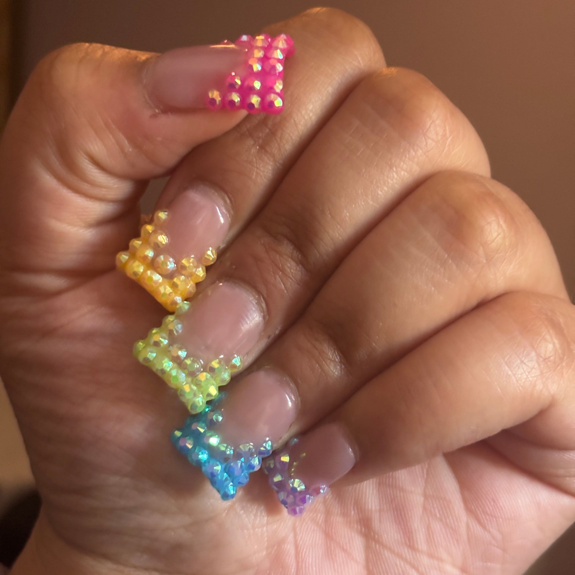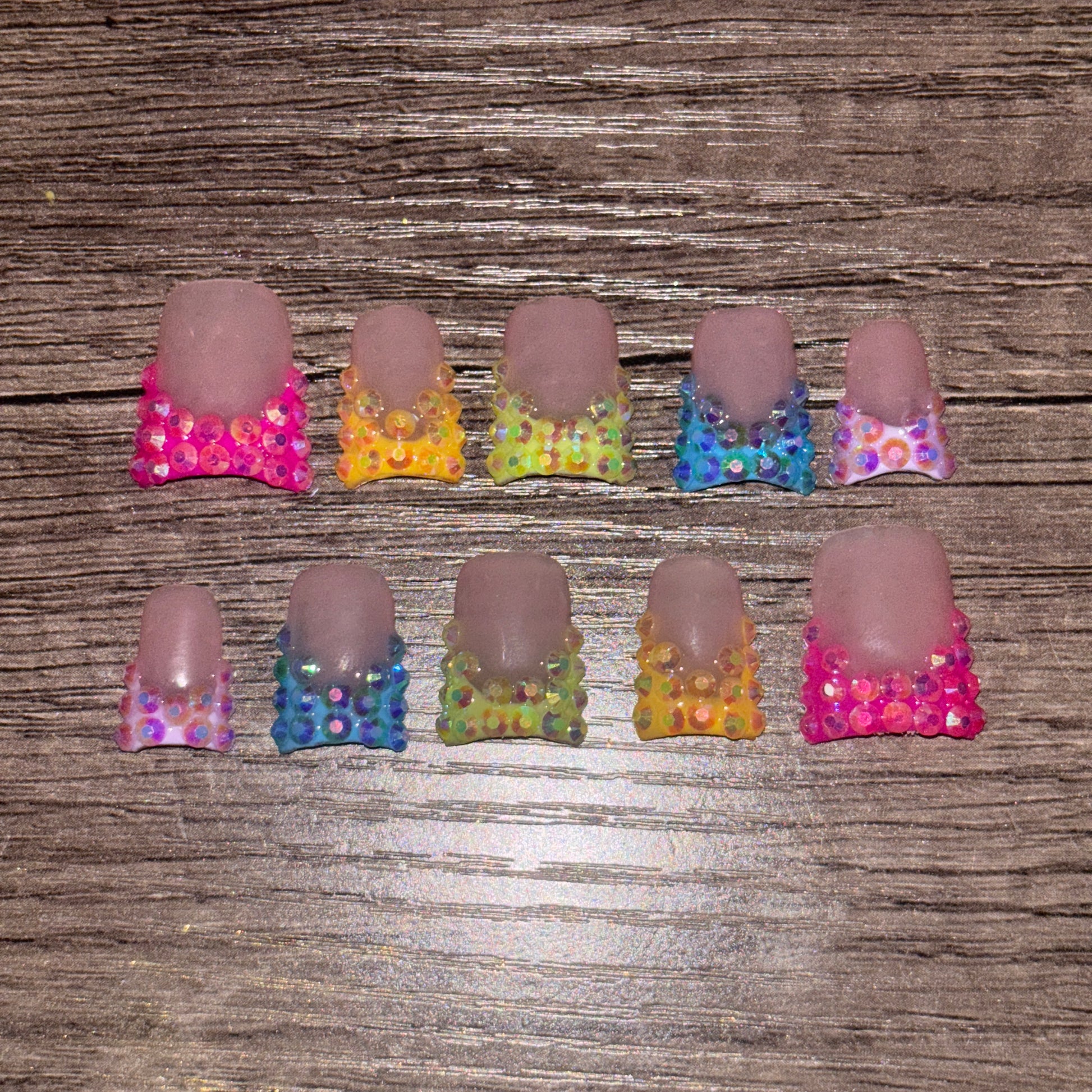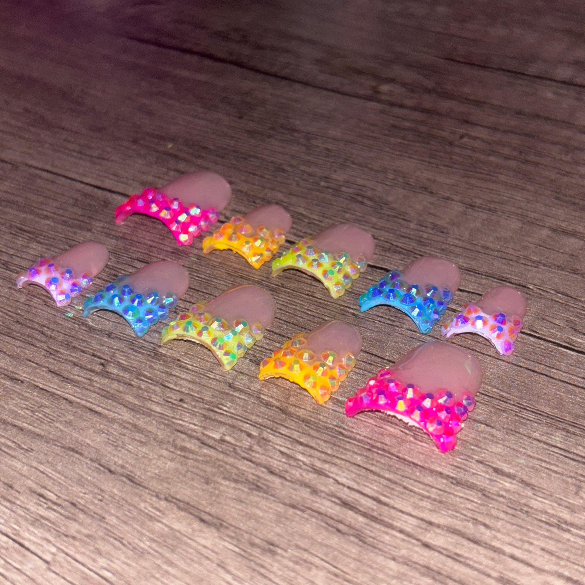 Add a splash of sparkle with The "Cyncere" Set—featuring dazzling blinged-out French tips adorned with iridescent rhinestones that catch every rainbow hue. These salon-quality nails are reusable, durable, and easy to apply, making gorgeous fingertips convenient and hassle-free. Perfect for showing off your playful side with a touch of glam!