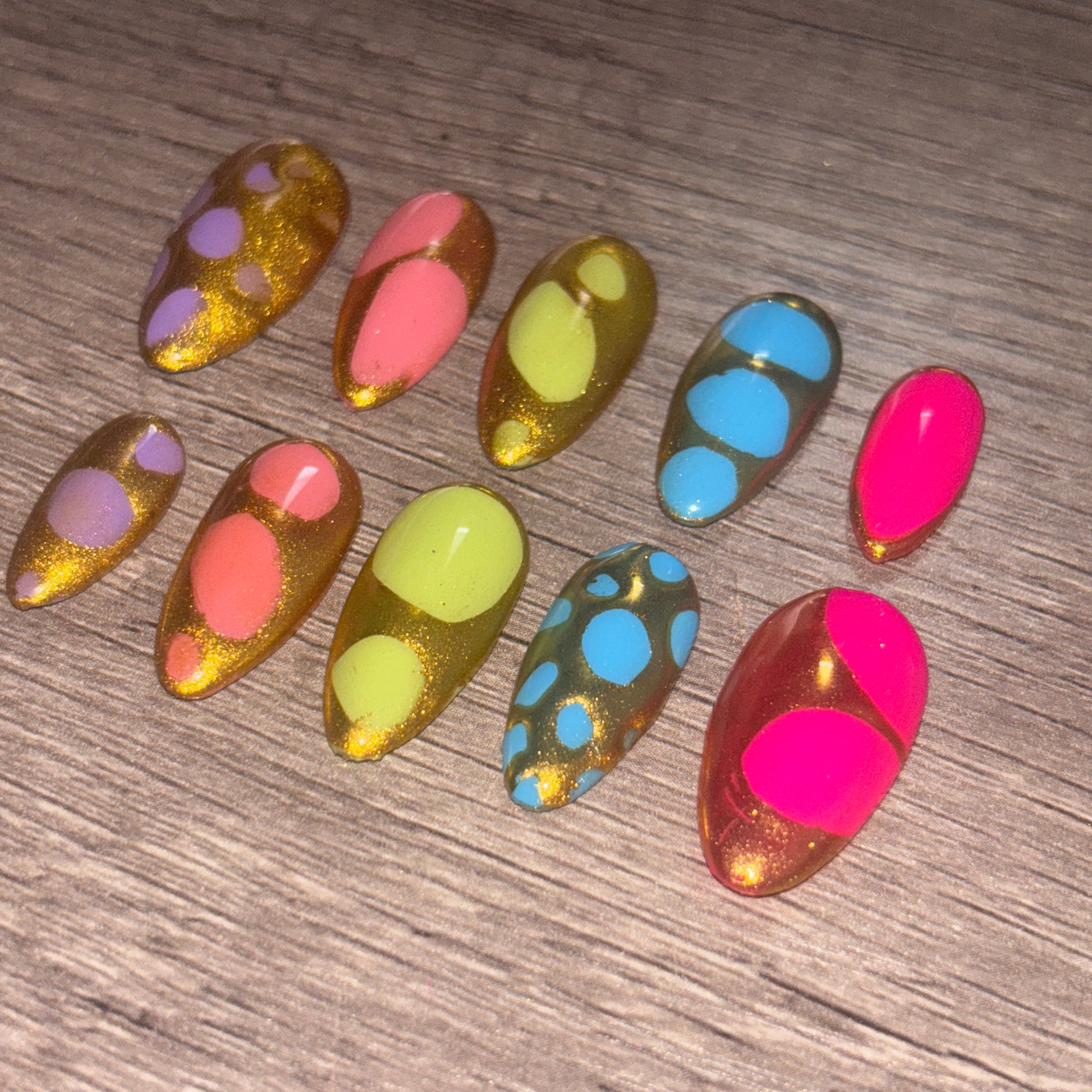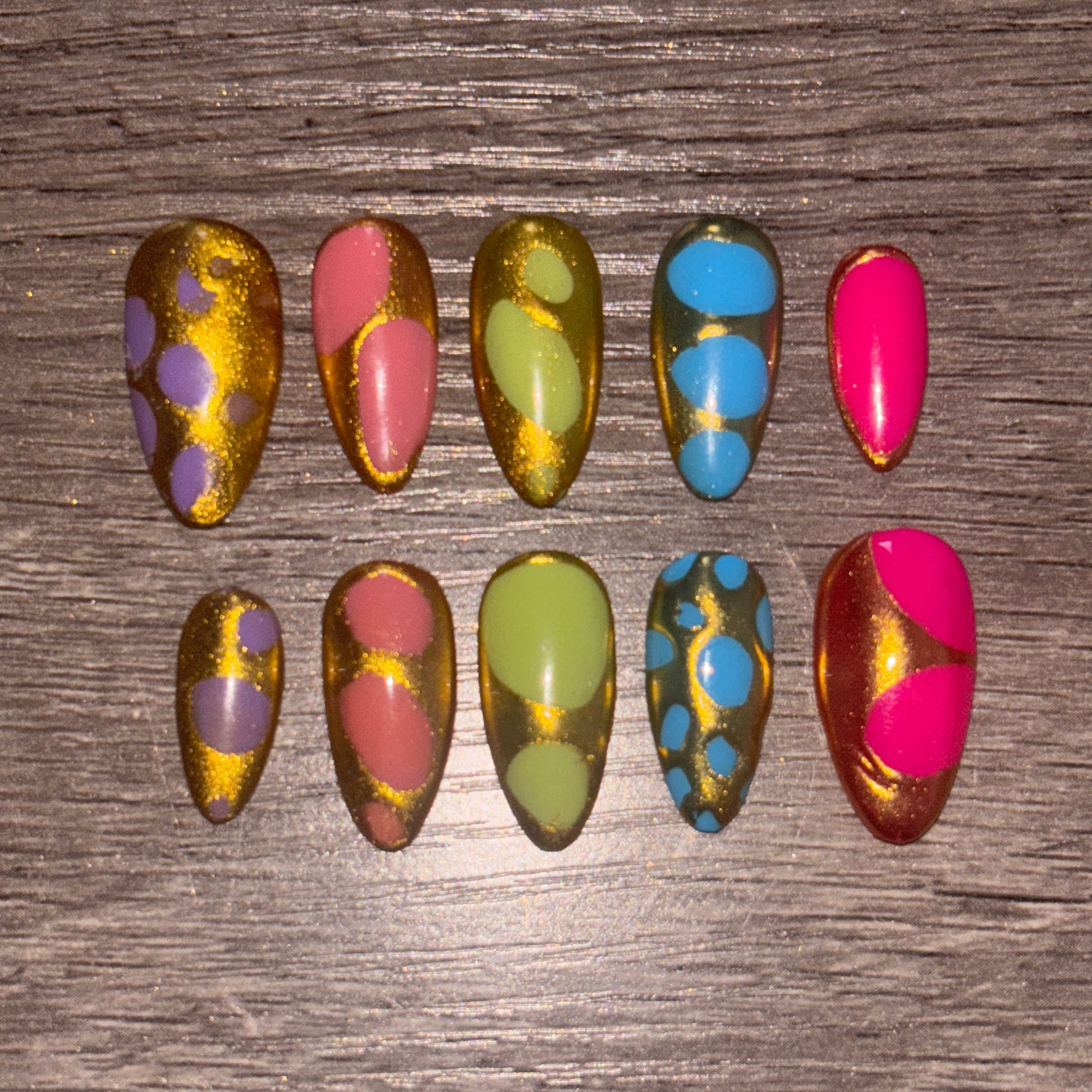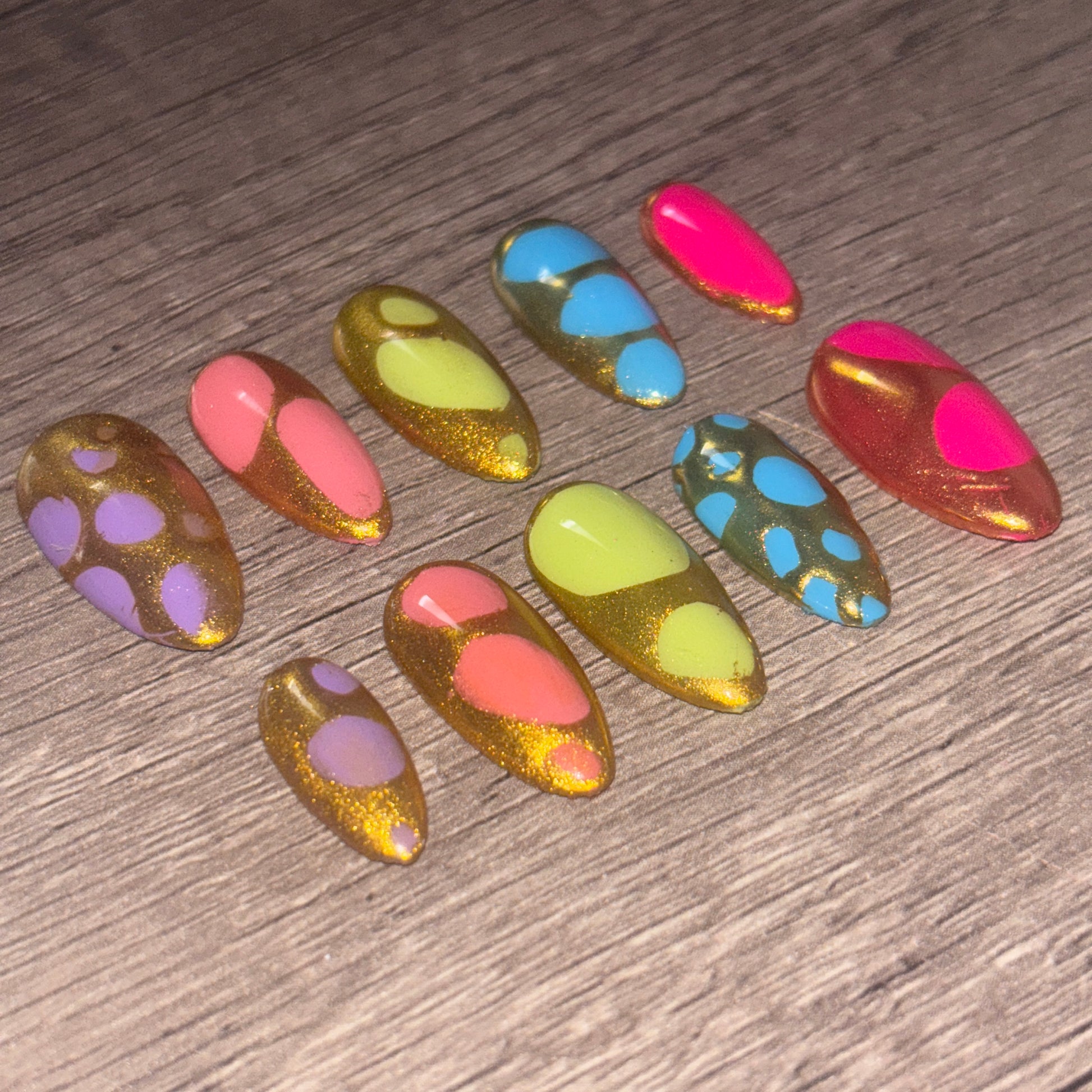 Add a splash of fun and color to your nails with The "Zaria" Set! These funky press-on nails feature unique chrome details that shine brightly on every tip. Designed with salon-quality durability, they’re perfect for anyone who loves cute, reusable nail art that stands out. Easy to apply and even easier to adore, Zaria brings playful style right to your fingertips!
